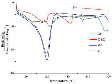 O espectro de infravermelho da β-CD mostrou bandas de absorção em 3346 cm-1 (estiramento O - H), 2928 cm-1 (estiramento C - H), 1154 cm-1 (estiramento C - O) e 1026 cm-1 (estiramento C - O - C). O espectro de IV do OEC mostrou bandas de absorção entre 3077 e 2835 cm-1 (estiramento C - H), 1639 e 1611 cm-1 (estiramento C = C), 1510 cm-1 (estiramento do anel aromático), 1246 cm-1 (estiramento de C - O arílico), característicos da presença do estragol. O espectro de infravermelho da MF mostra picos característicos tanto da β-CD quanto do OEC, sugerindo pouca ou nenhuma interação entre as moléculas. No espectro do complexo de inclusão (CI) observou-se uma forte semelhança com o espectro da β-CD. Em especial, as bandas características do OEC em 2835, 1639, 1611 e 1510 cm-1 tiveram uma acentuada redução de intensidade comparada aos espectros isolados do OEC e da MF, sugerindo que estas ligações possivelmente estão implicadas na formação destes complexos, visto que a inserção de uma molécula-hóspede no interior da cavidade da β-CD provoca uma restrição conformacional, reduzindo a livre movimentação das moléculas encapsuladas, reduzindo a intensidade do sinal. Esse mesmo efeito foi percebido por Fini,39 Oliveira,33 e Rocha31 quando prepararam complexos de inclusão utilizando a β-CD. Além destes efeitos, observou-se ainda o deslocamento das bandas de estiramento OH da β-CD em 3346 cm-1 para 3338 cm-1 no CI e da banda de estiramento C - H da β-CD em 2928 cm-1 para 2919 cm-1 no CI, reforçando a teoria da formação do complexo de inclusão. Calorimetria exploratória diferencial (DSC) Calorimetria exploratória diferencial (DSC) é uma das técnicas mais utilizadas para confirmar a formação do complexo de inclusão no estado sólido, devido a sua sensibilidade em detectar possíveis alterações nos eventos térmicos característicos da molécula hóspede quando esta se encontra no interior da cavidade da ciclodextrina, bem como a estabilidade do sistema e sua cristalinidade.10,12,14,40 O comportamento térmico de todos os materiais foi investigado usando DSC em atmosfera inerte (Figura 7). O termograma da β-CD e da MF mostra um acentuado pico endotérmico em 120 ºC. Este evento térmico, de acordo com Wang14 e Karathanos41 possivelmente é provocado pela perda de água presente no interior de sua cavidade hidrofóbica. Este pico está muito reduzido no termograma do CI, indicando um possível deslocamento das moléculas de água por moléculas de estragol, indicando que ocorreu a formação do complexo. Ainda na Figura 7 pode ser observado no termograma de DSC, característico do OEC, composto por um pico endotérmico em 108 ºC, 118 ºC e 190 ºC. A curva DSC da MF parece ser a simples superposição da curva DSC da β-CD. Entretanto, um padrão diferente foi observado na curva DSC do CI. O pico endotérmico em 120 ºC teve sua intensidade reduzida, indicando que parte da água que estava inicialmente presente na β-CD foi deslocada pelo OEC, devido sua maior afinidade pela cavidade hidrofóbica da β-CD,14 sugerindo a formação do complexo. Aliado a este fenômeno, o pico exotérmico em 200 ºC no termograma do OEC desaparece no CI, indicando uma maior estabilidade do OEC complexado quando comparado ao óleo livre.