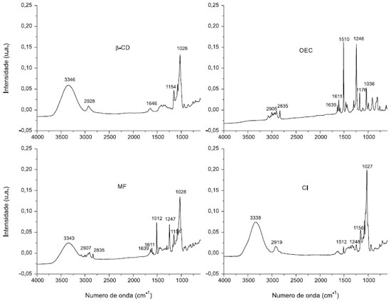 ![]() Figura 6. Espectros de Infravermelho das Amostras de β-ciclodextrina (β-CD), Mistura Física (MF), Complexo de Inclusao (CI) e óleo essencial de Croton zehntneri (OEC)