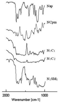 ![]() Figure 1. FTIR spectra of (i)Nap; (ii) NCpm; (iii) N1C1; (iv) N1C2; (v) N1SM1