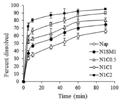 The dissolution profiles of crystalline naproxen and freeze-dried powders have been evaluated over a period of 90 minutes (Figure 5). Because of its poor aqueous solubility, crystalline naproxen (Nap) exhibited a slow rate of dissolution even when the medium contained 0.1% SLS (i.e., 66.27% released at the end of the 90 min period). Drug dissolution was improved with the increase in the amount of calcium carbonate in the freeze-dried formulations. The freeze-dried powder, N1C2, exhibited the greatest percentage of dissolution (94.96%) while N1C0.5 and N1C1 showed 80.86 and 78.30% release, respectively. A small improvement in dissolution of naproxen was observed in N1SM1 (74.82%).