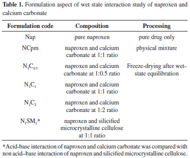 EXPERIMENTAL Materials Naproxen was collected from Ranbaxy laboratory, Gurgaon, India as a gift sample. Calcium Carbonate (assay: >98.5%), microcrystalline cellulose (pH value of 10% aqueous suspension: 4.5-7.5) and colloidal silicon dioxide (pH of 4% w/v aqueous dispersion: 3.5-4.4) were purchased from Merck, Mumbai, India. All other chemicals were obtained commercially as analytical grade reagents. Aqueous state equilibration and freeze-drying Physical blends of naproxen with calcium carbonate, microcrystalline cellulose and colloidal silicon dioxide were prepared as per the formulation code mentioned in Table 1. The drug-excipient slurry was prepared by adding small amount of water and was left overnight for a period of 12 h at ambient conditions as per Table 1. The wet mass was dried in a freeze-dryer (Lark, Penguin Classic Plus, India) for 10 hrs or until it was completely dry. The temperature and pressure during freeze-drying were maintained approximately at -40 ºC and 15-20 Pa, respectively. The freeze-dried sample was preserved in the desiccator till further analysis.