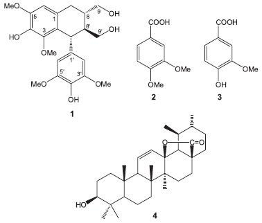 RESULTS AND DISCUSSION As part of our search for biologically active metabolites from the Celastraceae species growing in the Yucatan Peninsula in Mexico, we have studied the leaves of Maytenus phyllanthoides. As a result, we have isolated the cyclolignan of the tetralin type (+)-lyoniresinol (1). Moreover, two other phenolic compounds, veratric (2) and vanillic (3) acids were identified, as well as five pentacyclic triterpenes [i.e., lupeol, oleanolic acid, 3-β-hydroxy-urs-11-en-28,13β-lactone (4) (Figure 1)], and a mixture of α- and β-amyrin] together with trans-polyisoprene and the ubiquitous β-sitosterol. The isolated compounds were identified by spectroscopic methods, mainly by 1H and 13C nuclear magnetic resonance (NMR), including 1D and 2D, homo- and heteronuclear experiments [i.e., distortionless enhancement by polarization transfer (DEPT), correlation spectroscopy (COSY), heteronuclear single-quantum correlation (HSQC), and heteronuclear multiple bond correlation (HMBC)], and by the comparison with the data reported in the literature.
