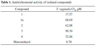 ILaboratorio de Química Farmacéutica. Facultad de Química. Universidad Autónoma de Yucatán. Calle. 41 No. 421 x 26 y 28, Col. Industrial. C.P. 97150, Mérida, Yuc., México Recebido em 13/06/2013 *e-mail: mrejon@uady.mx Cyclolignan (+)-lyoniresinol (1), veratric acid (2), vanillic acid (3), lupeol, oleanolic acid, 3β-hydroxy-urs-11-en-28,13β-lactone (4), the mixture of α- and β-amyrin, trans-polyisoprene, and β-sitosterol were isolated from the leaves of Maytenus phyllanthoides. The structures of the isolated compounds were established based on spectroscopic data, mainly 1H and 13C nuclear magnetic resonance (NMR). Compound 1, its acetate analog 1a, and compounds 2, 3, and 4 were tested against Trichomonas vaginalis. (+)-Lyoniresinol showed activity corresponding to IC50 17.57 µM. This is the first report on the occurrence of 3β-hydroxy-urs-11-en-28,13β-lactone (4) in the Celastraceous family and lyoniresinol in the Maytenus genus, and on the antitrichomonal activity of lyoniresinol. INTRODUCTION Infections caused by protozoa are the leading cause of morbidity and mortality among human parasitic infections.1Trichomonas vaginalis is a flagellated protist that causes trichomoniasis, a common sexually transmitted human infection, increasingly recognized as an important disease in both women and men.2 According to the WHO, approximately 180 million cases are reported annually worldwide.3 Studies indicate that trichomoniasis is associated with the predisposition to cervical cancer, pelvic inflammatory disease, infertility, increasing infections by human papillomavirus (HPV), birth outcomes, and human immunodeficiency virus (HIV).4 Moreover, the relationship between serum antibodies of T. vaginalis and prostate cancer has been recently established.5 Presently, the Food and Drug Administration (FDA) recommends metronidazole and tinidazole for the systemic treatment of trichomoniasis. However, several resistant clinical isolates to these drugs have been recently described. Therefore, the need to find novel trichomonacidal agents to improve T. vaginalis infection drug therapy is imperative.6 It is well known that natural products could be a source of potent and selective drugs.7 In this context, plants of the Maytenus genus (Celastraceae) are known to produce several bioactive compounds, including antiprotozoal compounds.8 This genus is widely distributed around the world mainly in the tropics and subtropics. In Africa, the areas of the major diversity of the genus are found in Ethiopia, South Africa, the Canary Islands, and the Northwest African mountains. The distribution of the genus in the new world is diverse and can be found throughout the continent, from southern United States to Tierra del Fuego in South America, as well as in the Caribbean.9 Maytenus phyllanthoides (sweet mangrove) is a Mexican native species widely distributed either at coastal areas of the Pacific Ocean or Gulf of Mexico, growing at dunes or marshes and at the margins of mangrove areas. The species is an evergreen, branched, creeping or prostrate large shrub or small tree that grows up to 12 ft. The leaves are leathery, always green, from oval to elliptical shaped (1-2 in), and the flowers white to green (0.75-1 in).10 According to ethnobotanical records, the leaves of this species are used in the northern states of México, for the treatment of rheumatism in Baja California Sur, and against dysentery and toothache in Sonora.11 In a previous antiprotozoal screening performed in our laboratories, the CH2Cl2 and methanol extracts of the leaves of Maytenus phyllanthoides Benth. showed antitrichomonal activity (4.6 and 37.96 mg/mL, respectively), which encouraged further phytochemical studied in order to find the bioactive compounds. This paper reports on the phytochemical investigation of the leaves of Maytenus phyllanthoides Benth. and on the evaluation of the antitrichomonal activity of the isolated compounds.