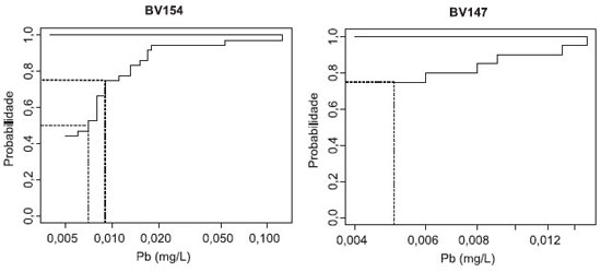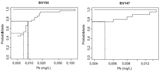 ![]() Figura 2. Probabilidade de sobrevivência gerada pelo método Kaplan-Meier após inversão dos dados de concentração de chumbo (subtração de todos os valores por uma constante maior que o máximo da amostra) em duas estações de monitamento dos cursos d'água da bacia do rio das Velhas - MG (limite de detecção do método igual 0,005 mg/L). As linhas pontilhadas demonstram o cálculo dos percentis. Em BV154 (com 45% de censura) é possível calcular a mediana e percentis superiores (linhas pontilhadas nos percentis 50 e 75). Em BV147 (75% de censura) só é possível calcular percentis iguais ou maiores que 75