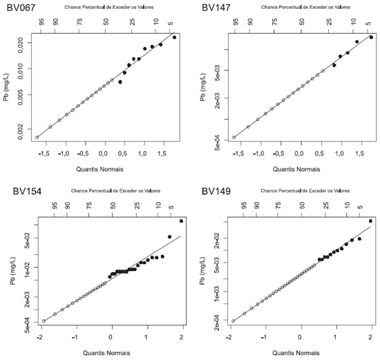 ![]() Figura 1. Aplicação de um método de imputação (ROS) a partir de um gráfico normal QQ em quatro estações de monitamento da concentração de chumbo em cursos d'água da bacia do rio das Velhas - MG. Os valores censurados (pontos brancos menores) foram extrapolados a partir da distribuição normal melhor ajustada ao logarítimo dos dados acima do limite de detecção (pontos pretos). Em BV149 verifica-se um ajuste satisfatório dos dados não censurados à distribuição normal. Em BV154 e BV067 nota-se um ajuste pouco satisfatório dos dados. A estação BV147 apresenta elevado percentual de censura (75%) e os dados extrapolados são gerados a partir de poucas amostras, reduzindo a confiabilidade do método