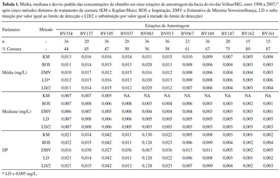 ESTUDO DE CASO A bacia hidrográfica do Rio das Velhas, localizada na região central do Estado de Minas Gerais, compreende uma área de 29.173 Km², onde estão localizados 51 municípios, que abrigam uma população de cerca de 5 milhões de habitantes. Os cursos d'água dessa bacia têm sido monitorados desde 1997 no âmbito do programa "Águas de Minas".21 Nesse estudo, 29 (vinte e nove) estações de monitoramento, distribuídas ao longo da bacia, são utilizadas para a amostragem de diversos parâmetros de qualidade das águas, com freqüências trimestral ou semestral. Dentre os diversos poluentes detectados nos cursos d'água merece destaque o chumbo, que apresenta grande relevância ambiental e à saúde humana.38 As características desses dados de monitoramento quanto ao tamanho da amostra e percentual de censura, para os dados obtidos entre 1998 e 2007, em onze locais distintos, são apresentados na Tabela 1. Considerando o limite de detecção de 0,005 mg/L, verifica-se a ocorrência de proporções variadas de concentrações abaixo do limite de detecção (44 a 87%) nos pontos de monitoramento. Essa variação na proporção entre os pontos consiste em uma dificuldade adicional para a seleção do método de tratamento da censura.