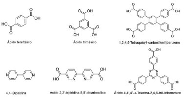 ![]() Figura 2. Ligantes (moléculas aromáticas policarboxiladas, bipiridinas e moléculas poliazoheterocíclicas) comumente utilizados na síntese de MOFs