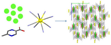 ![]() Figura 3. Síntese pelo método dos blocos de construçao da MOF [Ln(mpca) 2(CH3OH)2Ln(H2O)6Mo(CN)8]·xCH3OH·yH2O. Código de cores: verde: lantanídeo; vermelho: oxigênio; amarelo: molibdênio; azul: nitrogênio; cinza: carbono. Atomos de Ln (III) estao coordenados com átomos de Mo (IV), moléculas de metanol e com o ligante orgânico 5-metil-2-pirazina carboxilato - mpca, tanto no átomo de nitrogênio quanto nos átomos de oxigênio do grupo carboxila, formando uma rede tridimensional