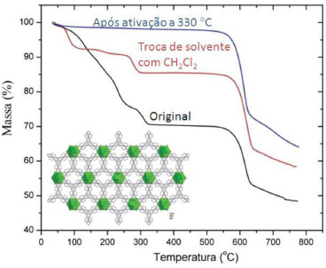 ![]() Figura 4. Análise termogravimétrica da MOF [La(btb)(H2O).3dmf]n, como sintetizada e após as etapas de ativaçao a 330 °C e troca de solvente com diclorometano. A MOF mostra alta estabilidade térmica, mesmo após os processos de troca de solvente e ativaçao térmica. Adaptado da referência 35 com permissao da The Royal Society of Chemistry
