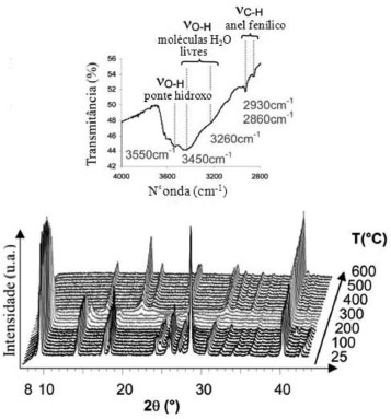 ![]() Figura 5. Espectros de absorçao no infravermelho e de difraçao de raios-X da MOF MIL-71 (ou VIII 2(OH)2F2{O2C-C6H4-CO2}.H2O) submetida a aquecimento até 600 °C. As bandas de infravermelho em torno de 3500 cm-1 confirmam a presença de grupos OH e água na estrutura, enquanto as bandas em torno de 2900 cm-1 sao características dos anéis fenílicos do ligante. Os espectros de DRX mostram estabilidade até 250 °C. Adaptado da referência 40 com permissao da The Royal Society of Chemistry