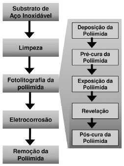 ![]() Figura 1. Fluxograma do método de fabricaçao de máscaras mecânicas de sombra utilizando aço inoxidável, ácido clorídrico como agente oxidante e poliimida como resina protetora