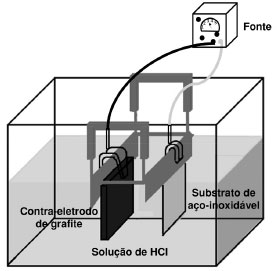 Para a montagem da célula eletroquímica foi utilizado um contraeletrodo de grafite e solução de HCl (38%) diluído 1:3 (v:v) em água. De modo a estabilizar a corrente que flui no eletrólito foi adicionado 10 mg de NaCl na solução. A folha de aço inoxidável foi imersa na solução de HCl juntamente com o eletrodo de grafite. Aplicou-se então uma corrente elétrica de 1,0 A utilizando uma fonte de corrente e tensão Keithley Source Meter 2410C, variando-se o tempo de eletrocorrosão de acordo com a área da folha de aço inoxidável a ser oxidada. A Figura 2 mostra um desenho esquemático da cuba utilizada no processo de eletrocorrosão. Ao término do processo, a folha de aço inoxidável foi submetida a um tratamento com plasma de oxigênio para remover o filme de poliimida.