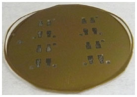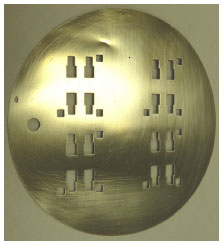 ![]() Figura 7. Máscara mecânica de sombra em aço inoxidável após a remoçao da resina de poliimida