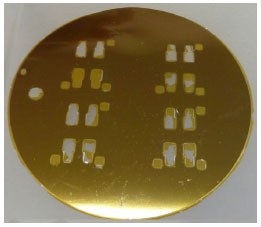 ![]() Figura 4. Padrao fotogravado na folha de aço inoxidável com a resina poliimida