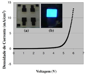 ![]() Figura 8. Curva I-V para um dispositivo OLED. No detalhe: (a) foto de um conjunto de 4 dispositivos OLED e (b) foto de um dispositivo OLED de 9 mm2 de área ativa emitindo luz