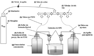 CONFECÇÃO DO EQUIPAMENTO PARA EXTRAÇÃO EM FASE SÓLIDA O equipamento de extração desenvolvido e detalhado na Figura 2 tem como princípio básico o uso de pressão positiva gerada por um fluxo de nitrogênio gasoso (N2(g)) diretamente no interior do frasco contendo amostra. O nitrogênio gasoso pressuriza o frasco de amostras e a amostra é direcionada ao cartucho de SPE. A entrada do gás pelo frasco garante a passagem da amostra pela tubulação de aço-inox e, posteriormente, pela fase estacionária do cartucho de extração com uma vazão constante.