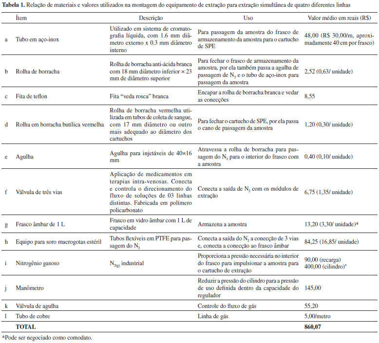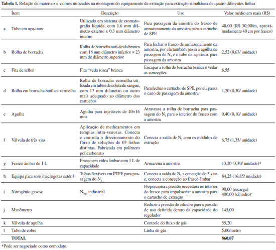 CUSTOS DO EQUIPAMENTO DE EXTRAÇÃO Equipamentos comerciais automáticos para SPE têm seus preços muito elevados, variando entre US$ 15.000,00 a US$ 35.000,00. Por outro lado, o equipamento desenvolvido neste trabalho possui um custo reduzido que será analisado neste tópico. Para construção do equipamento de extração, foram utilizados materiais de fácil acesso e sem nenhuma especificidade. Tal condição facilita a instalação do equipamento em qualquer laboratório e reduz o custo de sua elaboração. Os materiais utilizados para construção do equipamento, bem como os seus valores unitários, estão descritos na Tabela 1.