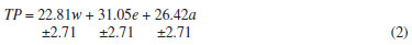 The response surface for yield as a function of the percentage composition of water, ethanol and acetone is shown in Figure 2 (A). The highest value on the contour graph occurred between positions 7 (equal portions of all three solvents) and 4 (w:e, 1:1). ANOVA was applied to the linear, quadratic, and also special cubic models, and showed no significant lack of fit at the 95% confidence level for total polyphenol content. The quadratic and special cubic models showed R2 of 0.68 and 0.75, respectively. Thus, the special cubic model is better in predicting the behavior of the mixture, although only the linear terms are significant. The special cubic model is given by (2) and is shown in Figure 2 (B):