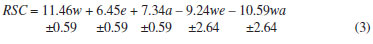 The dark region at number 7 indicates the best composition of the extraction solvent to obtain the total polyphenol extracts from S. terebinthifolius. ANOVA was applied to the linear, quadratic, and also special cubic models, and showed no significant lack of fit at the 95% confidence level for Radical-Scavenging Capacity (RSC). The quadratic model with R2 = 0.90 is given by (3) and is shown in Figure 2 (C):