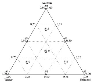 ![]() Figure 1. Simplex centroid design used to optimize the extraction. The points correspond to the mixtures in Table 1