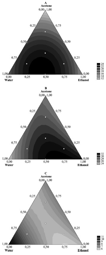 ![]() Figure 2. Response-surface contour plots of the quadratic model for (A) yield,(B) TP, and (C) IC50 as a function of the composition of water, ethanol, and acetone