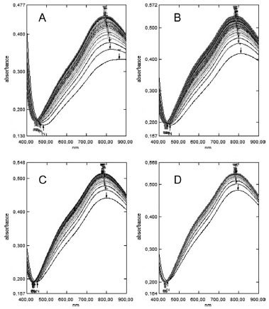 ![]() Figure 3. Absorption spectra (900-400 nm) for the solutions of CE at different concentrations of sodium carbonate (w v-1). (A) 5.0%, (B) 7.0%, (C) 10.75% and (D) 14.06%