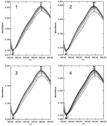 ![]() Figure 4. Absorption spectra (900-400 nm) for the reference substances in solutions containing 14.06% w v-1 anhydrous sodium carbonate: (1) gallic acid, (2) tannic acid, (3) catechin, and (4) pyrogallol