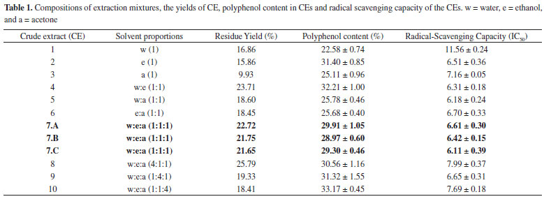 RESULTS AND DISCUSSION Table 1 shows the effects of the solvent compositions on the yield of CE of the bark of S. terebinthifolius. Comparing the averages of the CE yields showed the following trend: yield of CE from pure solvents (14.22 ± 3.06%) < solvent mixtures (20.25 ± 2.44%) < ternary solvent mixtures (22.39 ± 2.65%) (Figure 2 (A)). For the yields of CE from pure solvents, acetone gave the lowest yield while water gave the highest yield with ethanol generating intermediate yields. Maximum yields of CE were obtained with ternary solvent mixtures which were followed by yields from the water-ethanol binary mixture. Extraction with water resulted in the lowest polyphenol content in the CE, whereas maximum polyphenol content was obtained with the ternary solvent mixtures. A lower value of IC50 indicates a higher antioxidant activity. Higher antioxidant capacities (6.18 ± 0.24) in CEs were obtained with the binary solvent mixtures (water:acetone, 1:1 v v-1) . On the other hand, although independent use of ethanol gave lower yields, the extract showed high antioxidant capacity and polyphenol content. Response surfaces were determined for the yield, total polyphenol content, and antioxidant capacity as a function of the extraction solvent compositions.