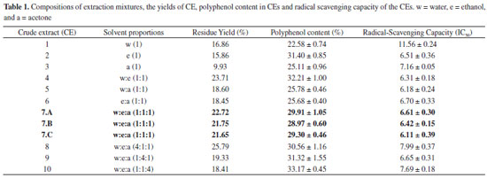 CONCLUSION This study indicated that use of ternary mixtures with approximately equal portions of water, ethanol and acetone to extract phenols from the bark of Schinus terebinthifolius Raddi (Anacardiaceae) resulted in higher yields of the crude extract, total polyphenol content, and antioxidant capacity. CEs with values of antioxidant capacity less than 6.0 were obtained with a binary mixture of water: ethanol (2:8, v v-1), water:acetone, and water:ethanol, in addition to that from pure ethanol. This study evaluated the extraction efficiency of different compositions of solvents on the bark of S. terebinthifolius. The determination of total polyphenols in CE of S. terebinthifolius showed satisfactory results with acceptable minimum requirements as stipulated by RE 899/2003, thereby ensuring the validity of the method. This methodology proved to be applicable in routine laboratory use for quality control.