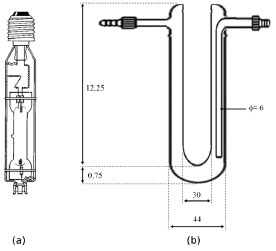 ![]() Figura 2. Representaçao da lâmpada de mercúrio sem bulbo (a) e da camisa de refrigeraçao usada no experimento (b). Medidas em milímetro
