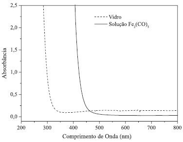 ![]() Figura 5. Espectros de absorçao na regiao UV-Vis do vidro do reator fotoquímico e da soluçao de Fe(CO)5 na concentraçao do experimento