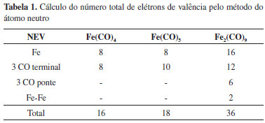 Geralmente, a configuração mais estável dos complexos organometálicos corresponde a um número total de 18 elétrons de valência (s2d10p6). Esta condição, denominada "regra dos 18 elétrons", permite conhecer antecipadamente quando um composto será estável por ter uma configuração de gás nobre, sendo pouco reativo. O cálculo do número de elétrons das espécies formadas neste experimento é apresentado na Tabela 1. Observa-se que o complexo final segue a regra dos 18 elétrons, o que indica configuração de máxima estabilidade.