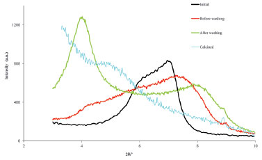 ![]() Figure 4. X-ray diffractograms in the 2θ region ascribed to d001 for an initial clay and the samples in various phases of the pillaring process