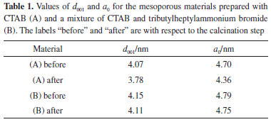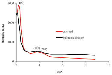 ![]() Figure 5. X-ray diffractogram for the MCM-41 sample, which was prepared using a mixture of CTAB and tributylheptylammonium bromide, before and after calcination