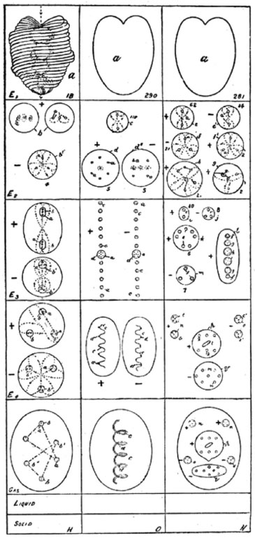 ![]() Figura 1. Os átomos dos elementos hidrogênio, nitrogênio e oxigênio e suas sucessivas subestruturas internas, até a partícula última ou anu (Besant & Leadbeater, La Chimie Occulte)