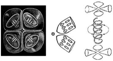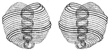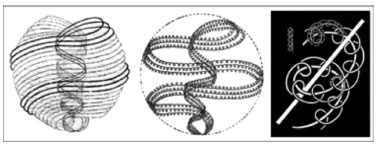 ![]() Figura 3. O anu ou "átomo físico último" é formado por filamentos que, se desagregados, resultam em filamentos menores, que por sua vez, sao formados por espirais menores ainda (Besant & Leadbeater, La Chimie Occulte)