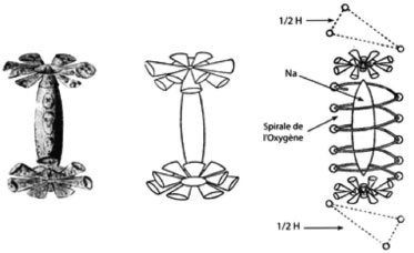 ![]() Figura 4. Estrutura do sódio (esquerda e centro) e identificaçao deste elemento na estrutura de um composto, o hidróxido de sódio (direita). Notar a espiral de oxigênio. Besant & Leadbeater, La Chimie Occulte