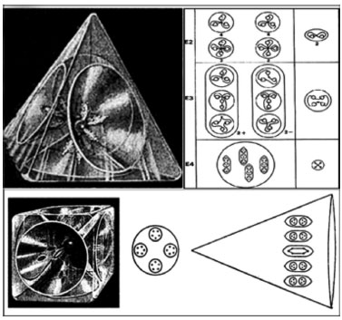 O Cubo caracteriza os elementos trivalentes. Eles possuem corpúsculos ovoides dentro de funis que estão alojados nas faces do cubo. O principal exemplo deste grupo é o boro (Figura 5). A figura mostra ainda a dissociação deste elemento em seus estados etéricos intermediários. O Octaedro é típico dos elementos tetravalentes. Neste grupo também aparecem funis, oito no total, que se dispõem sobre as faces de um octaedro. O principal exemplo é o carbono (Figura 6). A figura ainda apresenta suas duas subestruturas num estado etérico intermediário, e ainda um exemplo de como este elemento é identificado na visualização de um composto, no caso, o monóxido de carbono.