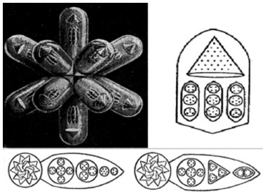 ![]() Figura 5. Acima: na parte esquerda é mostrado um átomo inteiro do berílio, e a direita suas subestruturas nos estados etéricos irtermediários E4, E3, E2 (Besant & Leadbeater, La Chimie Occulte). Abaixo: Na parte esquerda é mostrado um átomo inteiro de Boro, e a direita, suas duas subestruturas (Besant & Leadbeater, La Chimie Occulte)