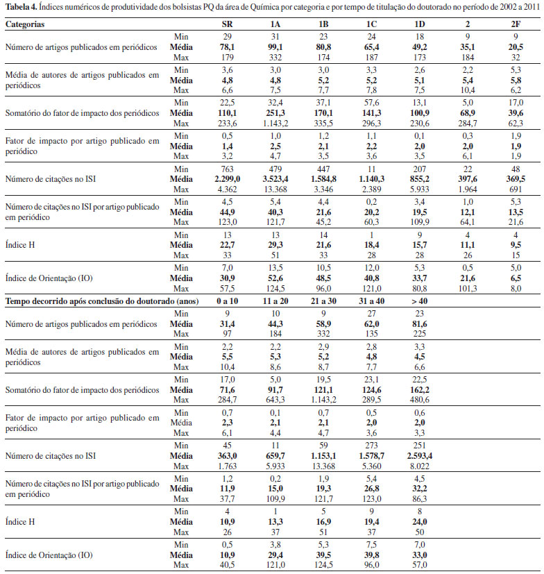 É possível perceber que há uma prevalência de publicação em periódicos nacionais, que ocupam as duas primeiras posições da lista. O primeiro periódico da lista é "Química Nova", que teve em média 187,2 artigos publicados nele por ano. Dos 695 bolsistas, 489 (70,4%) publicaram pelo menos uma vez nesse periódico no período de 2002 a 2011. E o segundo periódico da lista é o "Journal of the Brazilian Chemical Society", com média de 180,3 artigos publicados nele por ano. Dos 695 bolsistas, 498 (71,7%) publicaram nesse periódico. Dos periódicos da lista, apenas 2 (Revista Brasileira de Farmacognosia e Eclética Química) não possuem fator de impacto no JCR® de 2011, sendo que o primeiro fazia parte do JCR® quando a maioria dos artigos considerados foi publicado. Vale salientar que no total informado de artigos dos bolsistas, alguns desses são contabilizados mais de uma vez devido a coautorias, sendo esta a forma correta e usual quando se considera a produção científica de pesquisadores de mais de uma instituição.18 A média de autores nos artigos publicados no periódico "Química Nova" foi de 4,5 e no periódico "Journal of the Brazilian Chemical Society" foi de 5,3. Entre os periódicos com mais de 200 artigos no período de 2002 a 2011, o que tem a maior média de autores (8,0) é o "Bioorganic & Medicinal Chemistry". Existe uma diferença nas médias de autores por artigo publicado em periódicos diferentes. A razão destas diferenças mereceria uma análise mais profunda por especialistas da área. A Tabela 4 apresenta alguns índices numéricos de produtividade dos bolsistas no período de 2002 a 2011 de acordo com as suas categorias e pelo tempo decorrido após a conclusão do doutorado, sendo que para cada índice é apresentado o valor mínimo, médio e máximo. É importante observar que quando se consideram valores médios por categoria é necessário levar em conta que há uma quantidade muito maior de bolsistas da categoria 2 em comparação com as demais.