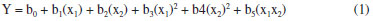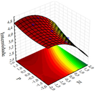 Deste modo, A foi fixada em 0,5 L min-1 para os estudos posteriores, visto que a mesma não teve alta significância na etapa de triagem. Para otimizar as duas variáveis significativas foi usado o CCD.26,29 Essas variáveis foram estudadas em cinco níveis, sendo que o nível zero estabelecido foi de 0,62 L min-1 para a variável N e 1350 W para a variável P. A Tabela 3 apresenta a otimização de N e P com base na matriz do planejamento composto central. A partir da matriz CCD obtém-se um polinômio com duas variáveis x1(N) e x2(P) usado para descrever o modelo quadrático em estudo. Os ensaios foram realizados de forma aleatória para não haver erros estatísticos associados. A Equação 1 apresenta o modelo algébrico usado para otimização das variáveis x1(N) e x2(P). ![]() Na qual b0 é o valor da média dos pontos centrais e b1 até b5 são os coeficientes do modelo a serem determinados. Os coeficientes da equação do modelo foram obtidos por meio da Equação 2: ![]() Na qual X é a matriz de contraste, Xt é a transposta de X e a matriz Y é a média das intensidades normalizadas. Sendo assim, a Equação 3 foi obtida para o modelo de otimização de N e P: ![]() A partir do modelo descrito pela Equação 3 foi possível gerar a superfície de resposta das variáveis N e P para a otimização dos cinco elementos. A Figura 2 apresenta a superfície de resposta usada para otimização das variáveis N e P.