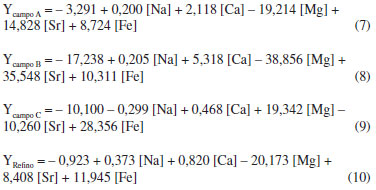 A partir do dendograma os extratos aquosos de petróleo foram separados em três grupos. Além disso, os extratos do refino E15 a E18 foram totalmente separados dos demais extratos. Já os extratos E5, E11 e E14 não foram classificados corretamente, o que era esperado somente para o extrato E5, conforme foi observado na classificação usando a PCA. Esta classificação errônea indica que as amostras E5, E11 e E14 têm características diferentes dos óleos do seu campo de origem. Para finalizar a classificação das amostras foi aplicada a LDA, obtendo funções matemáticas por meio de combinações lineares que minimizam as variações dentre um mesmo grupo de amostras e maximizam as diferenças entre os grupos diferentes, identificando o grupo que cada amostra pertence.34 Dentre as técnicas de análise exploratória aplicadas, a LDA é a única metodologia supervisionada, viabilizando a utilização industrial, pois o modelo não precisa ser recalculado quando são inseridas amostras desconhecidas a serem classificadas. As equações 7, 8, 9 e 10 são funções discriminantes geradas para os campos A, B, C e para o refino R, respectivamente. ![]() A partir dos modelos gerados pela técnica LDA percebe-se que Mg, Sr e Fe são as variáveis que desempenham o papel mais importante na discriminação das amostras de extrato aquoso de petróleo. Além disso, a LDA indicou que 4 amostras não foram classificadas corretamente, totalizando uma porcentagem de 92,6% de predição correta. Foi observado que a amostra E5 foi classificada novamente como pertencente ao campo B, comprovando as classificações obtidas pela PCA e HCA, pois este extrato apresenta alto teor de Na comparado às amostras do campo A. Os modelos de reconhecimento de padrões apresentados são propostas interessantes para realizar a classificação de um petróleo com características desconhecidas, antecipando as informações para a indústria petrolífera e facilitando a tomada de decisões imediatas, como por exemplo, a destinação à determinada refinaria. Sendo assim, a análise exploratória aliada aos resultados obtidos por ICP OES traz agilidade na identificação dos campos de produção e do refino.