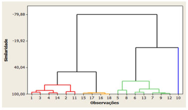 ![]() Figura 4. HCA: Dendograma correspondentes à classificaçao dos 18 extratos aquosos de petróleo