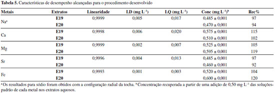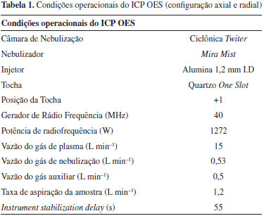 PARTE EXPERIMENTAL Instrumentação O equipamento ICP OES (Perkin Elmer, Modelo Optima 7000 DV, EUA) foi usado para a quantificação de Na, Ca, Mg, Sr e Fe. As seguintes linhas espectrais foram empregadas: Na I (589,592 nm), Ca II (317,933 nm), Mg I (285,213 nm), Sr II (407,771 nm) e Fe II (238,204 nm). A configuração radial foi usada para o sódio e a axial para os demais elementos. Para a realização das análises, um nebulizador Mira Mist foi usado para a introdução das amostras em uma câmara de nebulização ciclônica Twiter, ligados a uma bomba peristáltica. Em seguida, as amostras foram introduzidas no plasma formado na tocha de quartzo por um injetor de alumina 1,2 mm I.D. Todas as medidas foram feitas em triplicatas e as áreas dos picos de intensidade foram integradas nos respectivos comprimentos de onda de cada elemento. Os parâmetros utilizados para execução das análises estão listados na Tabela 1.