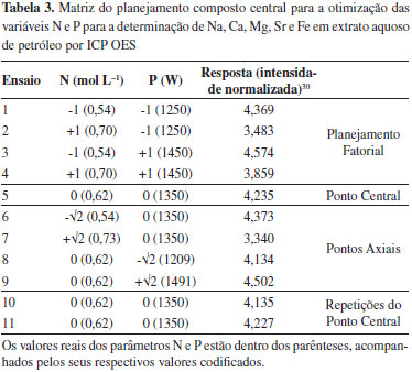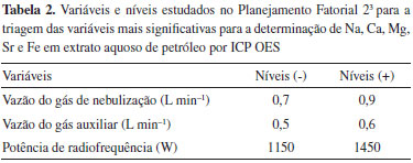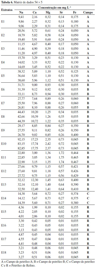 | Análise exploratória das concentrações dos metais NA, CA, MG, SR e FE em extrato aquoso de petróleo, determinados por ICP OES, após otimização empregando planejamento de experimentos Exploratory analysis of the concentrations of metals NA, CA, MG, SR and FE in aqueous extract of crude oil, determined by ICP OES, after optimization by experimental design |