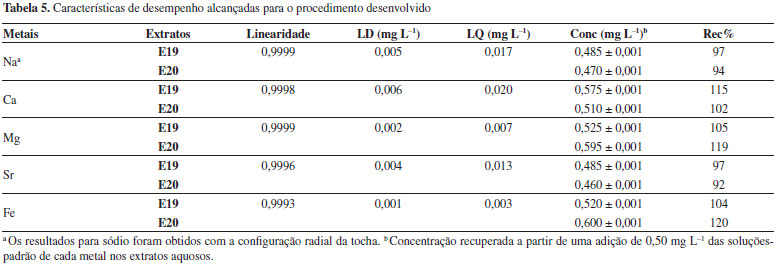 A obtenção do extrato aquoso do petróleo foi realizada utilizando a metodologia de extração ASTM D 6470-99 modificada.3 Sendo assim, homogeneizou-se e pesou-se uma massa de 40,0000 ± 0,1000 g de petróleo em um béquer. Ao mesmo recipiente acrescentou-se 70,0 ± 1,0 mL de xileno vertendo-se lentamente sobre a amostra, seguido de agitação manual e transferência da solução para um frasco extrator de 2 L. Em seguida, adicionou-se ao frasco extrator 25,0 ± 1,0 mL de álcool isopropílico e 15,0 ± 1,0 mL de acetona. A mistura foi aquecida até o início da ebulição; após 5 minutos de fervura interrompeu-se o aquecimento e acrescentou-se 125,0 ± 1,0 mL de água deionizada pré-aquecida em torno de 80 ºC. Na etapa seguinte, retomou-se a ebulição do frasco extrator por mais 15 minutos. Após o resfriamento da solução e separação das duas fases, durante cerca de 20 minutos, drenou-se a fase inferior (extrato aquoso), utilizando-se dois papéis de filtro (diâmetro 12,5 cm e porosidade 25 µm) para reter o óleo. Antes de cada extração foi realizado o branco de preparo usando o mesmo procedimento citado anteriormente, sem a adição do petróleo, a fim de controlar as contaminações. Otimização dos parâmetros operacionais do ICP OES: Planejamento fatorial completo e CCD Para a otimização dos parâmetros operacionais do ICP OES foi usada uma mistura equitativa de duas amostras de petróleo de um campo produtor diferente das demais amostras estudas, apresentando salinidades de 3303,40 mg kg-1 e 228,9 mg kg-1 NaCl e ºAPI de 25,7 e 24,1; respectivamente. Após extração da fase aquosa do petróleo, os extratos aquosos obtidos (E19 e E20, respectivamente) foram diluídos a uma concentração (salinidade) de aproximadamente 10 mg kg-1 de NaCl e as variáveis N, A e P do ICP OES foram estudadas. Desta forma, como os extratos aquosos foram diluidos, a salinidade inicial dos mesmos não foi um fator relevante para a escolha das amostras usadas na otimização. Por outro lado, levou-se em consideração somente o ºAPI das amostras para a otimização das condições operacionais do ICP OES. Sendo assim, utilizou-se um ºAPI intermediário ao das demais amostras com a finalidade de obter um procedimento que atendesse por igual às amostras com altos e baixos ºAPI. Após isso, usou-se o planejamento fatorial 23 para avaliar a significância dessas variáveis na obtenção do máximo sinal de intensidade para a determinação dos metais. Os parâmetros significativos (N e P) foram otimizados aplicando o desenho composto central (CCD) para maximizar a sensibilidade do ICP OES. A intensidade do sinal de emissão de cada analito foi normalizada (devido à discrepância entre a intensidade do sinal de cada elemento) e o somatório do sinal normalizado foi utilizado como variável resposta para cada condição estudada, obtendo somente uma reposta final (intensidade normalizada).30 Esta intensidade normalizada é utilizada para a otimização dos 5 elementos conjuntamente, visto que a intensidade de cada elemento em separado influencia de modo diferente na resposta final (intensidade normalizada). Um total de 16 ensaios (2k, sendo k o número de variáveis estudadas no planejamento fatorial completo, neste caso 23 = 8, em duplicata =16 ensaios) foi realizado na etapa de triagem. Já para a otimização das variáveis mais significativas um total de 11 ensaios (22 + 2k + 3, sendo k o número de variáveis estudadas no CCD, neste caso 22 + 2 × 2 + 3 = 11) foi realizado, dentre os quais três foram repetições do ponto central para cálculo dos erros padrões. Todo o processo de triagem e otimização dos experimentos foi executado utilizando a versão teste do software Statistica 6.0 e Microsoft Excel 2007 para o processamento dos dados obtidos. Análise exploratória: PCA, HCA e LDA Após a otimização dos parâmetros operacionais da técnica ICP OES, uma alíquota de extrato aquoso de petróleo foi adicionada em um tubo de polipropileno, com capacidade de 15,0 mL, juntamente a um volume de solução de padrão interno ítrio (Y). Os frascos foram aferidos com HNO3 0,2% v/v para 10,0 mL. Assegurou-se que a salinidade final da solução fosse próxima a 10,0 mg kg-1 de NaCl e a concentração final do ítrio na solução fosse 0,50 mg L-1. A faixa da curva de calibração para o ICP OES foi de 0,05 a 1,00 mg L-1 e todos os pontos da curva apresentaram uma concentração final de 0,50 mg L-1 de padrão interno ítrio. Para classificação dos 18 extratos aquosos de petróleo os resultados das concentrações dos metais obtidos pelo ICP OES foram submetidos aos métodos de análise exploratória PCA, HCA e LDA. Todo o processo foi executado utilizando o Software Minitab Statistical 14 (Minitab Inc., State College) para o processamento dos dados obtidos.