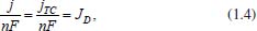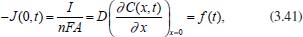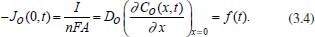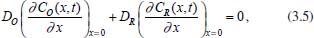 RESOLUÇÃO DA EQUAÇÃO DE DIFUSÃO Nesta seção serão apresentados alguns métodos matemáticos para a resolução da equação de difusão em coordenadas retangulares (difusão linear), esféricas e cilíndricas (difusão radial). Como visto na seção anterior, independentemente da geometria, a equação de difusão é sempre dada por uma equação diferencial parcial, envolvendo variáveis relacionadas ao tempo (t) e à posição da partícula em relação à superfície do eletrodo (x ou r). A sua resolução depende de pelo menos uma condição inicial relacionada à variável t, e pelo menos duas condições de contorno relacionadas à variável x ou à variável r. Estas condições dependem do fenômeno em estudo, da geometria do eletrodo e da técnica utilizada e, portanto, variam caso a caso. Leva-se em consideração, neste estudo, que não há reações químicas acopladas ao processo de transferência de carga e que as espécies O e R são solúveis e estáveis na solução. Coordenadas retangulares Considere um eletrodo plano de área A e um processo eletroquímico de oxidação ou redução, por exemplo, cujo fluxo das espécies se dá linearmente na direção perpendicular ao plano. De modo geral, a densidade de corrente j dada por I/A, sendo I a intensidade de corrente, relaciona-se com o fluxo da espécie oxidada O na superfície do eletrodo, JO (0,t), pela equação abaixo:10 ![]() sendo que ![]() e CO(x,t) e CR(x,t) representam, respectivamente, as concentrações das espécies O (oxidada) e R (reduzida) na posição x e no instante t, assim como JO e JR representam os fluxos destas espécies, DO e DR representam seus coeficientes de difusão, F é a constante de Faraday e q é o número de espécies que podem se reduzir. Em todos esses casos está sendo considerado que as espécies O e R não se solubilizam no eletrodo. As condições iniciais normalmente são determinadas pelo estado do sistema no início do processo, ou seja, em t = 0, enquanto que as de contorno levam em conta o que ocorre muito próximo da superfície do eletrodo (x → 0) ou distante dela, além da camada de difusão (x → ∞). Assim, em geral, tem-se: