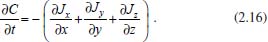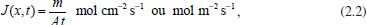 A 1ª lei de Fick estabelece que o fluxo de uma espécie, ou a quantidade de matéria que se difunde, por unidade de tempo, na direção perpendicular a uma região planar de área A, é proporcional ao gradiente de concentração da espécie. Matematicamente isso é descrito por ![]() em que C(x,t) representa a concentração da espécie no ponto x e no instante t, D é o coeficiente de difusão ou difusividade e o sinal negativo indica que o fluxo ocorre sempre na direção de maior para menor concentração. É importante observar que a 1ª lei de Fick é aplicada a sistemas: estacionários,4 ou seja, quando não ocorre variação da concentração com o tempo; em estados transientes para descrever o fluxo em um instante de tempo em uma determinada posição; como uma condição de contorno na resolução da 2ª lei de Fick ou mesmo na explicação para se obter a 2ª lei. Assim, será utilizado o símbolo Como a maioria das leis físicas, esta também foi proposta a partir de observações empíricas, e para compreender sua dedução teórica apresentaremos aqui uma formulação sucinta, de forma mais intuitiva e sem grande rigor matemático e físico, porém para os leitores que desejarem compreendê-la mais detalhadamente, sugerimos os livros de A. J. Bard e L. R. Faulker10 ou de J. O'M. Bockris e A. K. N. Reddy.3,4 Suponha, sem perda de generalidade, que o fluxo de uma espécie esteja ocorrendo da esquerda para a direita na Figura 1, passando pelo plano em um ponto arbitrário ![]() Portanto, considerando Δx ≈ 0, o fluxo no instante ![]() Em termos de concentração, em que o volume da região considerada é dado por V = AΔx, o fluxo é dado por ![]() Se a variação Δx for muito pequena (Δx → 0)10 tem-se a forma contínua da equação (2.6) e, para a análise matemática. é interessante que se tenha a quantidade Δx no denominador, pois isso levará a uma derivada, facilitando o tratamento matemático. Assim, multiplicando e dividindo o lado direito da expressão (2.6) por Δx e rearranjando os termos adequadamente, obtém-se ![]() em que a concentração é dada em mol cm-3 ou mol m-3. O termo (Δx)2 pode ser interpretado como a média dos quadrados das distâncias percorridas por todas as moléculas presentes neste movimento,4,10 possuindo, portanto, dimensão cm2. Assim, considerando a equação de Einstein-Smoluchowski,3,4 (Δx)2 = 2D ![]() Considerando ainda que as espécies químicas estejam desacopladas (as partículas se movem sem interação significativa entre elas), o coeficiente de autodifusão (parâmetro microscópico) corresponde ao de difusão (parâmetro macroscópico) e, por isso, a equação (2.8) pode ser substituída em (2.7), tendo-se ![]() e, quando Δx → 0, obtém-se ![]() Como ![]() conforme anunciado na 1ª lei de Fick. O coeficiente de difusão D é bastante sensível à variação de temperatura e frequentemente segue uma equação do tipo Arrhenius: ![]() em que Ea kJ mol-1 é a energia de ativação para difusão e D∞ é um valor hipotético de D a uma temperatura infinita T. Uma ilustração prática dessa lei de Fick é seu uso para caracterizar a difusão através de membrana biológica e outras membranas. Para aplicá-la a uma membrana celular de espessura ℓ há que se supor que ℓ seja tão pequeno que predomine a difusão de estado estacionário e que as fases solução em ambos os lados da membrana sejam bem misturadas. Neste caso, ∂C/∂x ~ (Cfora - Cdentro)/ℓ , em que Cfora e Cdentro representam as concentrações fora e dentro da membrana, respectivamente. O fluxo de difusão J é dado por D(Cfora - Cdentro)/ℓ, e D/ℓ é a permeabilidade.11 Como já observado, o desenvolvimento acima é válido apenas para difusão em estado estacionário, porém, a maioria das situações práticas envolvendo difusão ocorre em estado não estacionário, no qual a concentração da espécie varia tanto com a posição em que se encontra, quanto com o tempo. Se for considerada apenas a direção x, estas situações são usualmente representadas pela 2ª lei de Fick que, em coordenadas cartesianas (ou retangulares), é dada pela equação diferencial parcial ![]() A dedução desta equação será feita inicialmente para o caso mais geral, ou seja, a difusão espacial, que ocorre no espaço tridimensional. Como caso particular tem-se a equação (2.12). Considere, portanto, um paralelepípedo como o mostrado na Figura 2 e suponha que a difusão esteja ocorrendo através dele, cujos fluxos ocorram nos sentidos de x para x + dx, de y para y + dy e de z para z + dz, através dos planos yz, xz e xy, respectivamente.