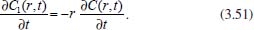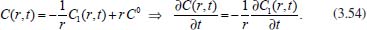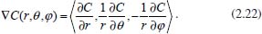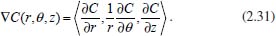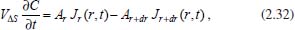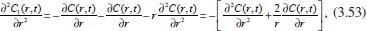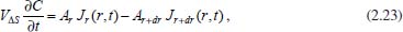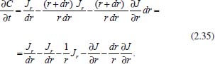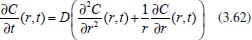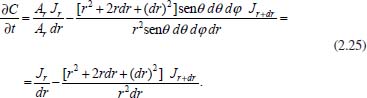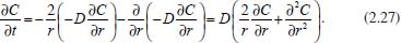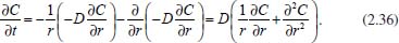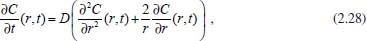 Como a ideia é exatamente a mesma dos casos anteriores, tem-se ![]() em que VΔS é o volume da região da camada cilíndrica, Ar é a área da parte do cilindro de raio r, Ar + dr é a área da parte do cilindro de raio r + dr, Jr é o fluxo passando por Ar e Jr + dr é o fluxo passando por Ar + dr. Como as dimensões dr, dθ e dz são infinitesimais, pode-se tomar valores aproximados para o volume VΔS e para as áreas Ar e Ar + dr, considerando ![]() Logo, da equação (2.32) segue que ![]() Utilizando a expansão de Taylor de primeira ordem para Jr + dr tem-se ![]() Novamente, cancelando os termos semelhantes com sinais opostos, fazendo dr tender a zero (dr → 0), utilizando a 1ª lei de Fick para o fluxo (lembrando que o gradiente agora é dado em termos de coordenadas cilíndricas) e considerando o coeficiente de difusão constante, obtém-se ![]() Portanto, em termos de coordenadas cilíndricas, a equação de difusão radial é dada por ![]()