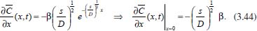 Portanto, se L[f (t)] é a transformada de Laplace de f (t), então, L[f'(t)] = s L[f (t)] - f (0)]. P3 (Transformada da derivada segunda): Se f é uma função contínua e diferenciável até segunda ordem em [0, ∞) tal que a transformada de Laplace de f e de sua derivada existam para todo t neste intervalo, então, a transformada da segunda derivada de f, L[f"(t)], existe e satisfaz ![]() Demonstração: Por definição, L[f"(t)] é dada por ![]() concluindo-se que ![]() P4 (Transformada envolvendo funções de duas variáveis): Se f é uma função contínua nas variáveis x e t, então, a transformada de Laplace de f deve ser calculada parcialmente em relação a cada variável. E as transformadas sucessivas também podem ser calculadas conforme segue: ![]() ![]() Demonstração: Consequência imediata da definição da transformada de Laplace e da integração de funções de várias variáveis.13 P5 (Transformada envolvendo derivadas de funções de duas variáveis): Se f (x, t) é uma função contínua com derivadas parciais contínuas até segunda ordem nas variáveis x e t, e se Lt[f(x,t)] = F(x, s), então ![]() Demonstração: Isso é consequência imediata do fato de que, se f é contínua e possui derivadas parciais contínuas até segunda ordem, então a ordem de integração e de diferenciação de f em relação às variáveis x e t não importa. Assim, pela definição de Lt tem-se ![]() Resolução 1 Retomando o problema de resolver a equação (3.6), dada por ![]() em que ![]() Aplicando a transformada de Laplace em relação à variável x tem-se: ![]() Utilizando as propriedades P3 e P5 e o Exemplo 1 tem-se ![]() Os valores de ![]() Tomando ![]() Separando o último termo em frações parciais2 tem-se: ![]() Logo, ![]() Portanto, considerando iguais os denominadores das frações em (3.20), a igualdade será verdadeira somente se os coeficientes dos termos semelhantes dos polinômios dos numeradores forem iguais, ou seja, se ![]() Da terceira equação obtém-se ![]() É um sistema linear de duas equações e duas incógnitas, cuja solução é facilmente calculada e dada por ![]() Como os valores de M e N não são conhecidos, pois dependem da técnica eletroquímica, os cálculos continuarão sendo feitos com β e γ para fins de simplificação da notação. Assim, ![]() Aplicando a transformada inversa de Laplace para p, que está relacionado com a variável x: ![]() Utilizando uma Tabela ou um software para encontrar as transformadas inversas tem-se: ![]() Observa-se que no caso do software Mathematica®, os comandos para calcular estas transformadas inversas são: InverseLaplaceTransform[1/p, p, x], com retorno: 1 InverseLaplaceTransform[1/(p+z), p, x], com retorno: e-xz InverseLaplaceTransform[1/(p-z), p, x], com retorno: exz Substituindo o valor de ![]() Utilizando a condição de contorno (3.6) pode-se calcular γ, pois ![]() Portanto, calculando o limite da expressão (3.25), quando x → ∞, tem-se ![]() o que ocorre somente quando γ = 0. Logo, ![]() Aplicando a transformada inversa de Laplace para s, que está relacionado com a variável t, tem-se ![]() Esta transformada inversa não aparece com muita frequência nas Tabelas, porém, quando encontrada é usualmente apresentada na forma ![]() Considerando ![]() Utilizando-se o software Mathematica® para calcular esta transformada inversa, o resultado é obtido diretamente fazendo: InverseLaplaceTransform[Exp[-x*Sqrt[s/D]], s, t], cujo retorno é Observa-se que valor de β depende de outra condição de contorno definida pela técnica eletroquímica utilizada. Resolução 2 Outra maneira de resolver o problema apresentado em (3.6) é por meio de uma mudança de variável que possibilita trabalhar com a equação diferencial parcial na forma de uma equação diferencial ordinária linear homogênea de fácil solução. Seja, então, ![]() a mudança que representa uma perturbação produzida na concentração inicial do sistema. Assim, C(x,t) = C0 -C1(x,t) e, derivando ambos os lados em relação à t obtém-se: ![]() Por outro lado tomando a segunda derivada em relação à x tem-se: ![]() Substituindo (3.31) e (3.32) na equação (3.6), a mesma torna-se: ![]() que é a equação de difusão conhecida, porém, as condições inicial e de contorno para C1 tornam-se, respectivamente, C1(x,0) e Aplicando a transformada de Laplace na equação (3.33) em relação à variável t e utilizando suas propriedades de derivadas obtém-se ![]() Como C1(x,0) = 0 segue que ![]() Fixando momentaneamente a variável s pode-se considerar a equação (3.34) como dependente apenas da variável x e, assim, obter uma equação diferencial ordinária de segunda ordem linear homogênea dada por ![]() Para resolver tal equação deve-se supor que suas soluções sejam do tipo ![]() Logo, a solução geral da equação (3.35) é dada por ![]() em que as constantes G e H devem ser obtidas a partir das condições de contorno. Como está sendo considerada apenas a condição semi-infinita ![]() o que ocorre somente quando H = 0. Consequentemente, a solução é dada por ![]() Como C(x,t)=C0 - C1(x,t), segue que ![]() Aplicando a transformada inversa em relação à s obtém-se a expressão da concentração, ou seja, ![]() que é igual à solução encontrada em (3.27), onde G = -β, cuja determinação depende de uma segunda condição de contorno, dada pela técnica eletroquímica. Observa-se que a técnica define a forma de perturbação de potencial, corrente ou carga, o que determina, por exemplo, qual dos casos especiais da equação de Butler-Volmer será utilizado e isso possibilita encontrar os valores de β ou G. Aqui somente se fará referência a processos de eletrodo com transferência de carga reversível em solução e sem qualquer complicação causada por adsorção, reação química acoplada, formação de nova fase etc. Isso significa que a relação potencial - concentração será dada pela equação de Ne
